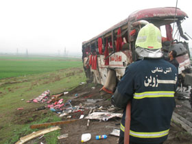 سيد علي شفيعي مديرعامل سازمان آتش نشاني و خدمات ايمني شهرداري قزوين افزود: ساعت 10/13 دقيقه روز شنبه بيست و ششم فروردين ماه يکدستگاه اتوبوس بنز در مسير اتوبان زنجان قزوين  حدفاصل پل کورانه در حال حرکت بوده که به علت لغزندگي جاده و عدم کنترل وسيله نقليه توسط راننده ، خودرو به سمت لاين مخالف منحرف مي شود که با برخورد با 2 تير برق و اتوبوس VOLVO در لاين مخالف ، حادثه تاسف باري روي مي دهد که نيرهاي برق نيز بر روي يکدستگاه سمند و يک دستگاه پرايد فرود مي آيند.