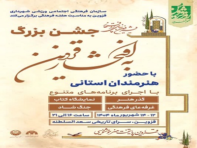 به مناسبت هفته فرهنگی قزوین جشن بزرگ به افتخار قزوین با حضور هنرمندان استانی و اجرای برنامههای متنوع"گذر هنر،نمایشگاه کتاب،غرفه های فرهنگی، جنگ شاد "توسط سازمان فرهنگی اجتماعی ورزشی شهرداری قزوین برگزار میشود.