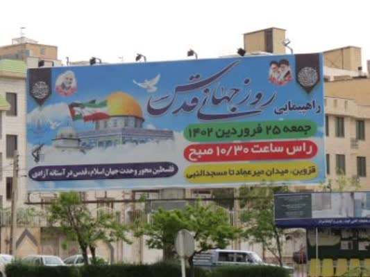 منجم، مدیرعامل سازمان زیباسازی شهرداری قزوین گفت: در آستانه فرا رسیدن روز جهانی قدس، این سازمان اقدام به فضاسازی شهر با نصب بنر بر روی سازه های پرتابل با موضوع روز قدس و دعوت مردم به شرکت در راهپیمایی این روز کرد.