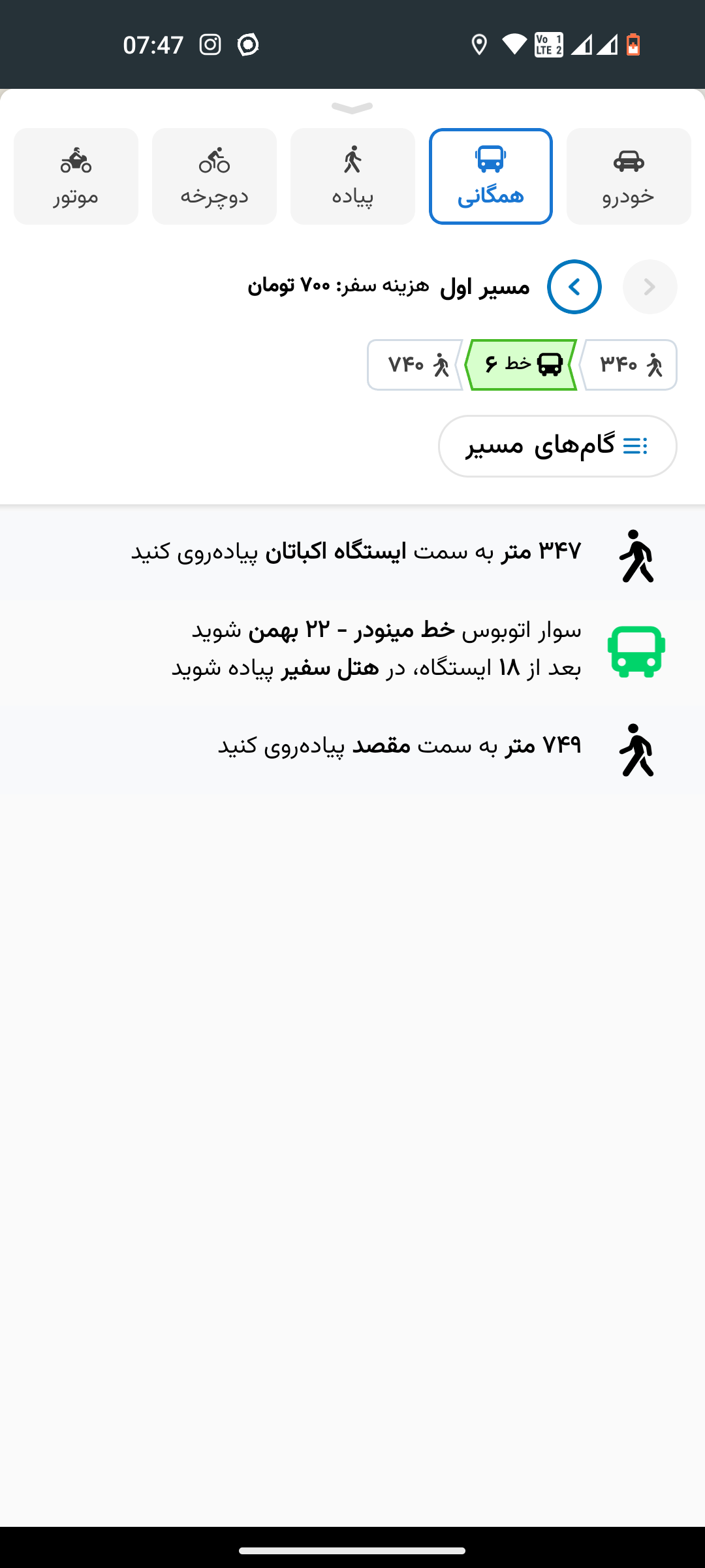وی در ادامه گفت: برای این منظور کافی است در برنامه نشان پس از انتخاب مبدأ و مقصد سفر خود در قسمت انتخاب نوع وسیله نقلیه بر روی گزینه "همگانی" کلیک کرده تا سفر شما بر اساس مسیر حرکت اتوبوسها؛ مینیبوسها یا خودروهای ون سازمان به همراه ذکر ایستگاه مبدأ و مقصد برای شما نمایش داده شود. همچنین برای مشاهده گامهای مسیر بر روی گزینه مربوطه کلیک کرده و مراحل سفر را مشاهده کنید.