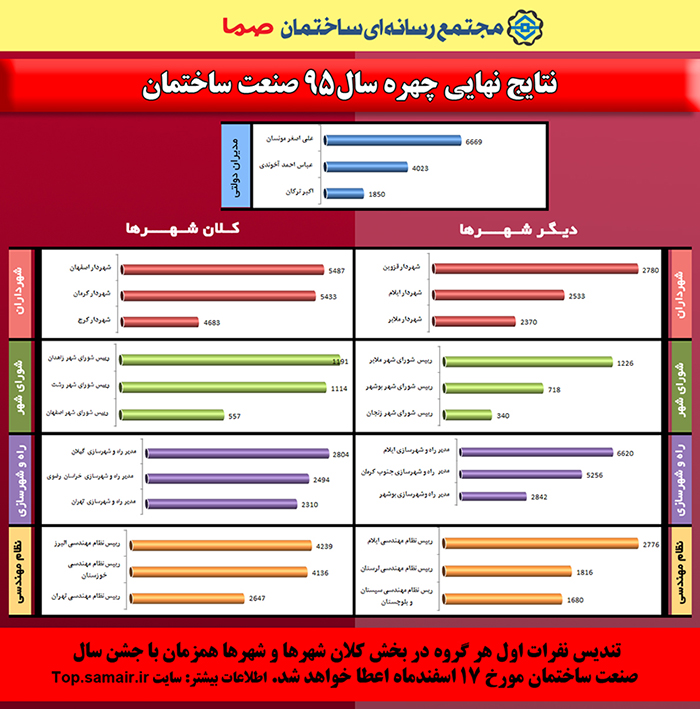 همچنين سيد کماالدين ميرجعفريان؛ مديرکل راه و شهرسازي ايلام با مجموع 6620 راي از آراي مردمي به عنوان چهره صنعت ساختمان در دسته شهرها و علي خاوري؛ مدير راه و شهرسازي گيلان با اخذ 2804 راي از آراي کاربران در دسته کلانشهرها توانستند عنوان چهره صنعت ساختمان سال 95 را در دسته «مديران راه و شهرسازي» به خود اختصاص دهند.